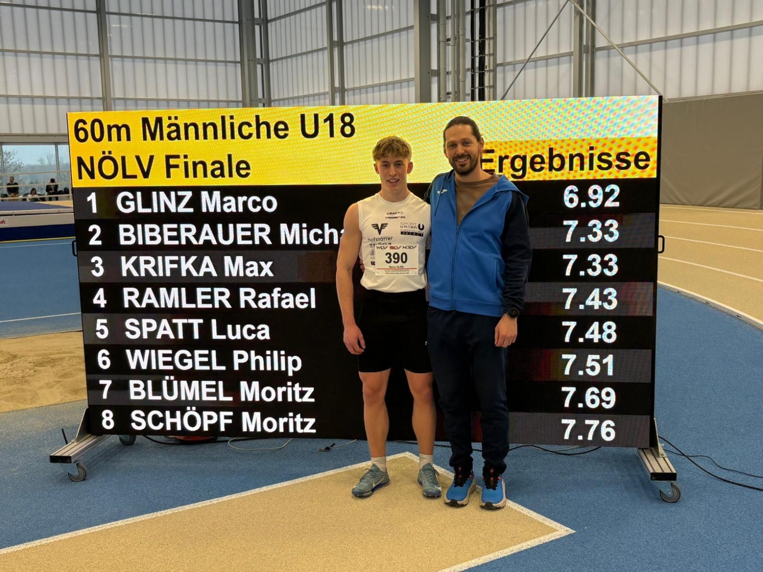 Marco GLINZ, der U18 Top- Athlet aus dem Mostviertel trat am Sonntag bei den U20 -Hallenmeisterschaften in Wien an, als einer der jüngsten Teilnehmer an diesem Wettbewerb, zeichnete er sich erneut im 60m-Lauf aus. GLINZ verbesserte nochmals seinen eigenen Rekord um 5-Hundertsel und setzte sich dabei an die Spitze der österreichischen Bestenliste in seiner Altersklasse.